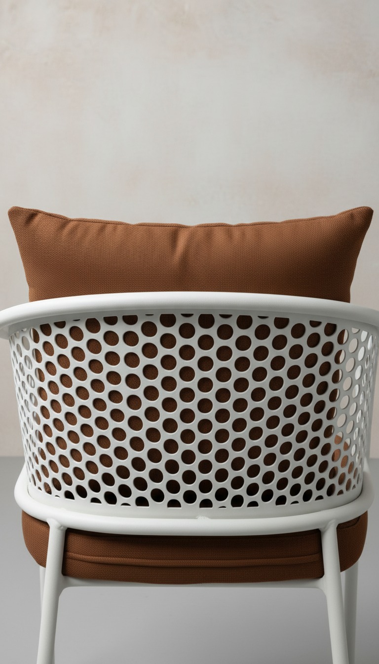 Dayanıklı metal iskelet yapısı ve özgün petek desenli sırt detayı ile hem iç hem de dış mekanlara modern bir dokunuş katar. Ergonomik tasarımı, konforlu oturma alanı ve sırt desteği sağlayan minderleri ile uzun süreli kullanımlar için idealdir. Bahçe, balkon veya modern yemek odası dekorasyonları için şık bir tercihtir.
