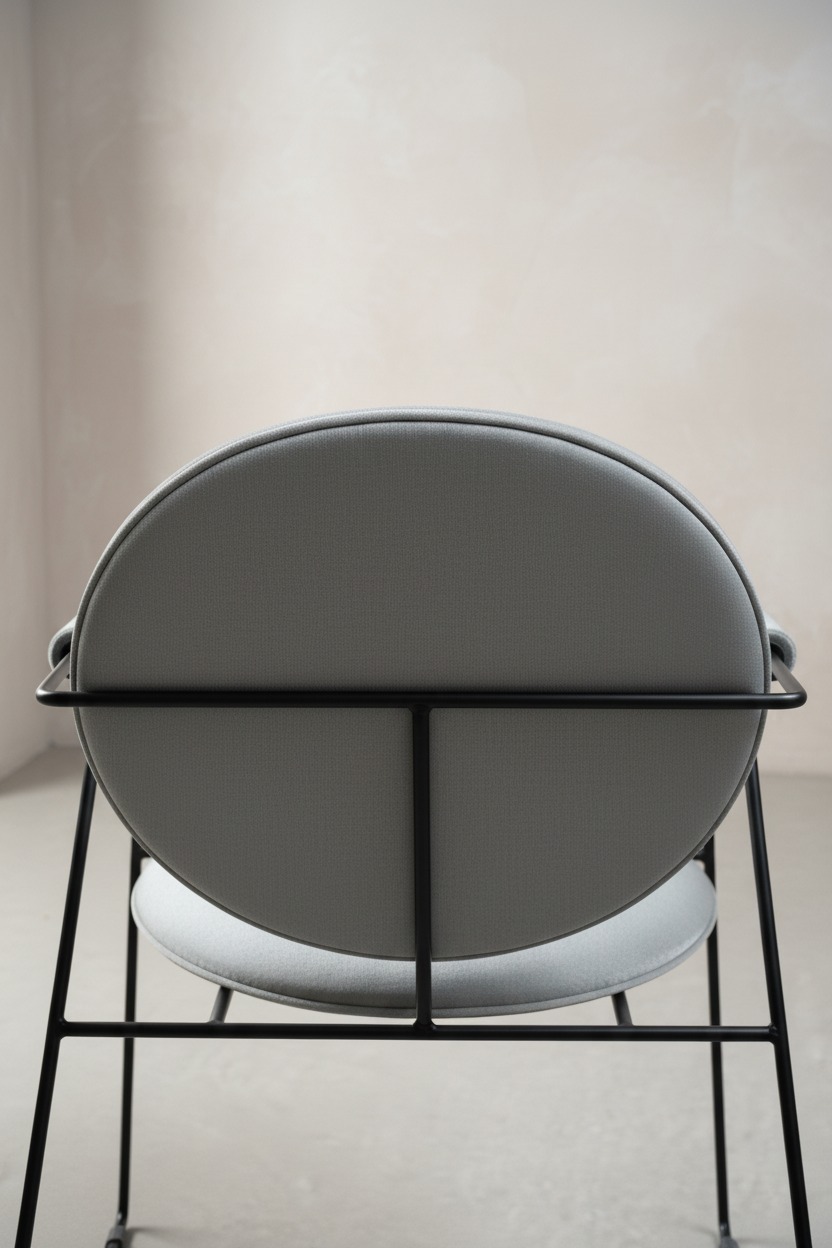 Zarif ve modern bir tasarıma sahip olan bu sandalye, ince siyah metal iskeleti ve dairesel formdaki konforlu minderleri ile dikkat çeker. Hem estetik hem de ergonomik yapısı sayesinde salonlardan çalışma odalarına, kafe ve restoranlardan ofislere kadar geniş bir kullanım alanı sunar. Kol kısımlarındaki döşeme detayları ekstra konfor sağlarken, minimalist yapısı mekanda ferahlık hissi yaratır.