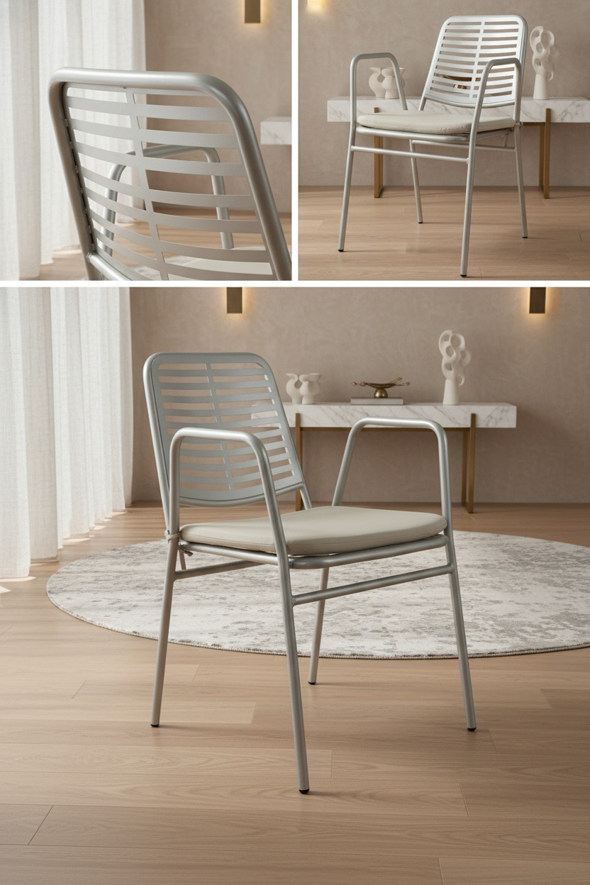 Dayanıklı metal gövdesi ve ergonomik tasarımıyla öne çıkan bu kollu sandalye, hem iç hem de dış mekanlar için idealdir. Yatay şeritli sırt tasarımı ve konforlu oturma minderi ile şıklığı ve rahatlığı bir arada sunar. Kafe, restoran ve bahçe kullanımı için uzun ömürlü bir tercihtir.