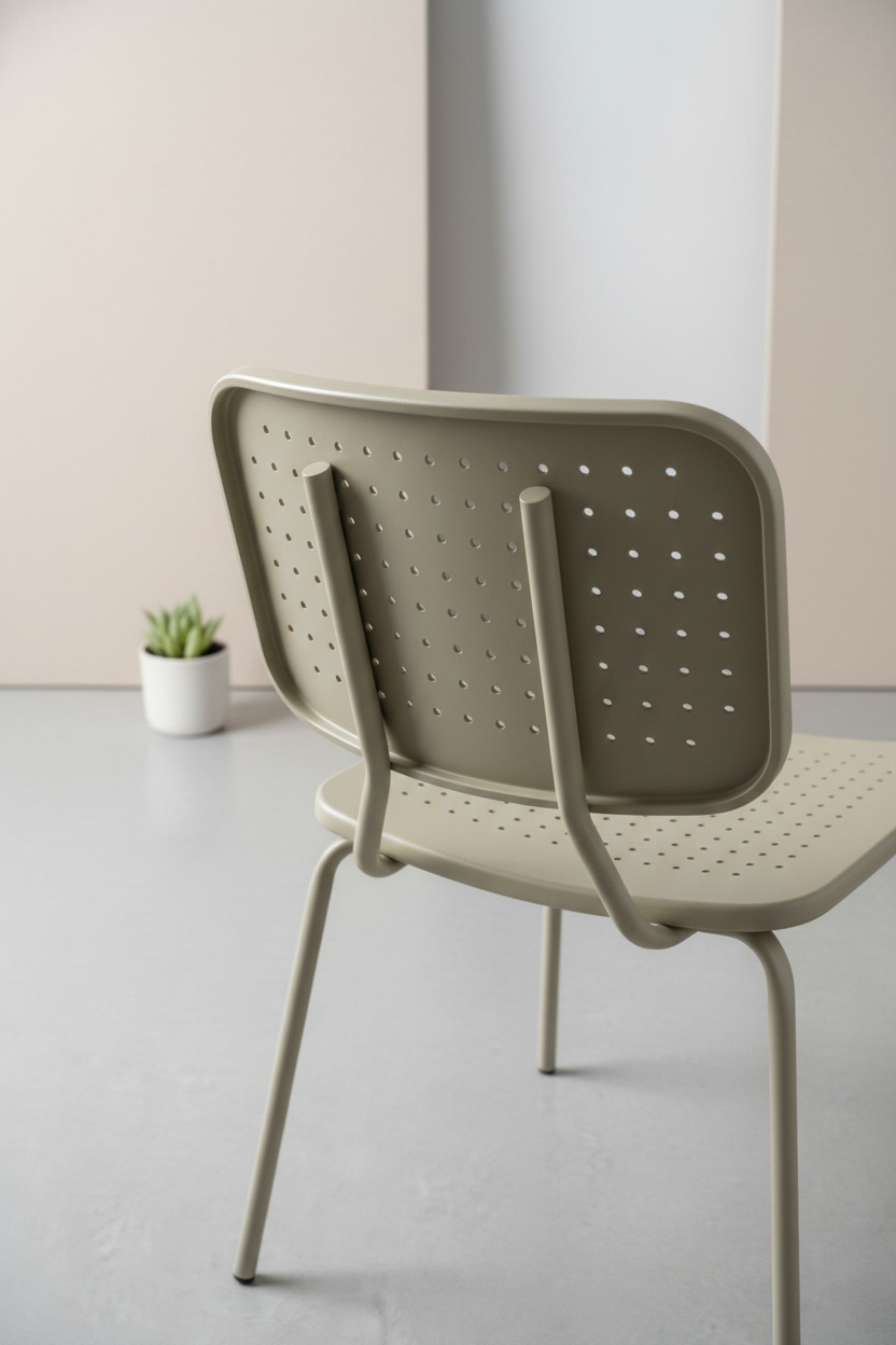 Dayanıklı metal gövdesi ve ikonik delikli tasarımıyla öne çıkan bu endüstriyel sandalye, minimalist ve retro bir estetik sunar. Hem iç mekanlarda hem de kapalı balkonlarda kullanım için ideal olan sağlam yapısı, uzun ömürlü kullanım vaat eder. Hava alan delikli yüzeyi konfor sağlarken, vintage görünümüyle mekanınıza karakter katar.