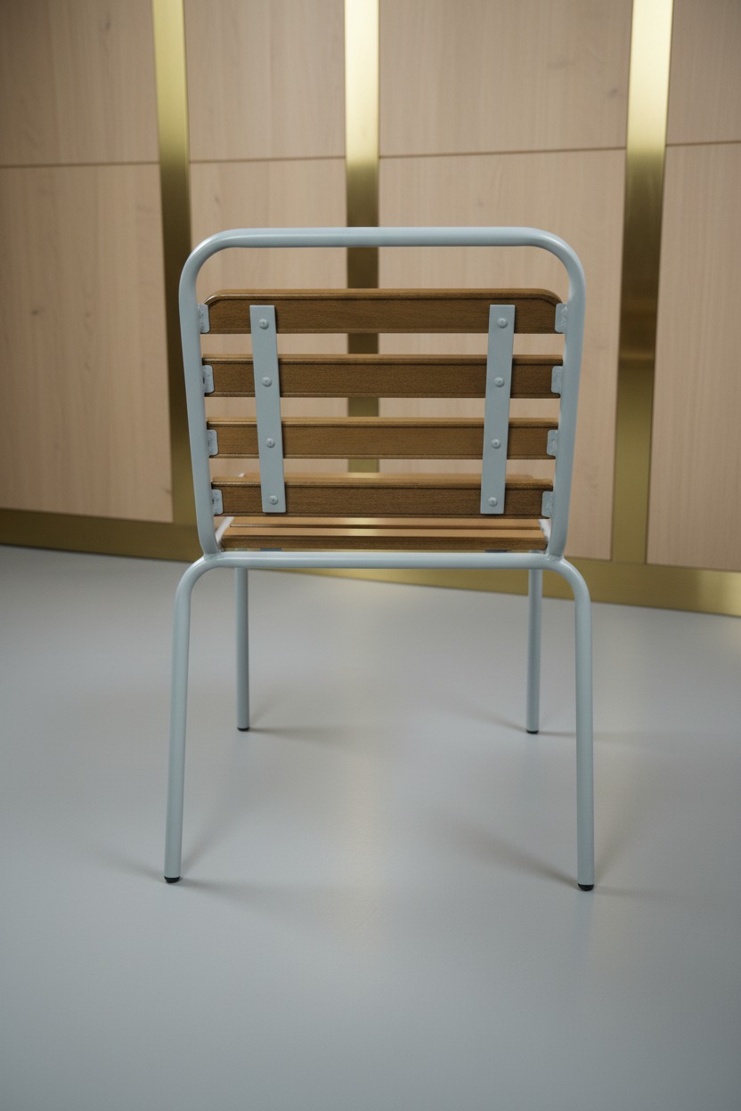 Dayanıklı metal gövdesi ve doğal ahşap çıtalarıyla hem iç hem de dış mekan kullanımına uygun, endüstriyel tasarıma sahip şık bir sandalye. Ergonomik yapısı ve sağlam malzemeleri sayesinde kafe, restoran ve bahçeler için uzun ömürlü kullanım sunar.