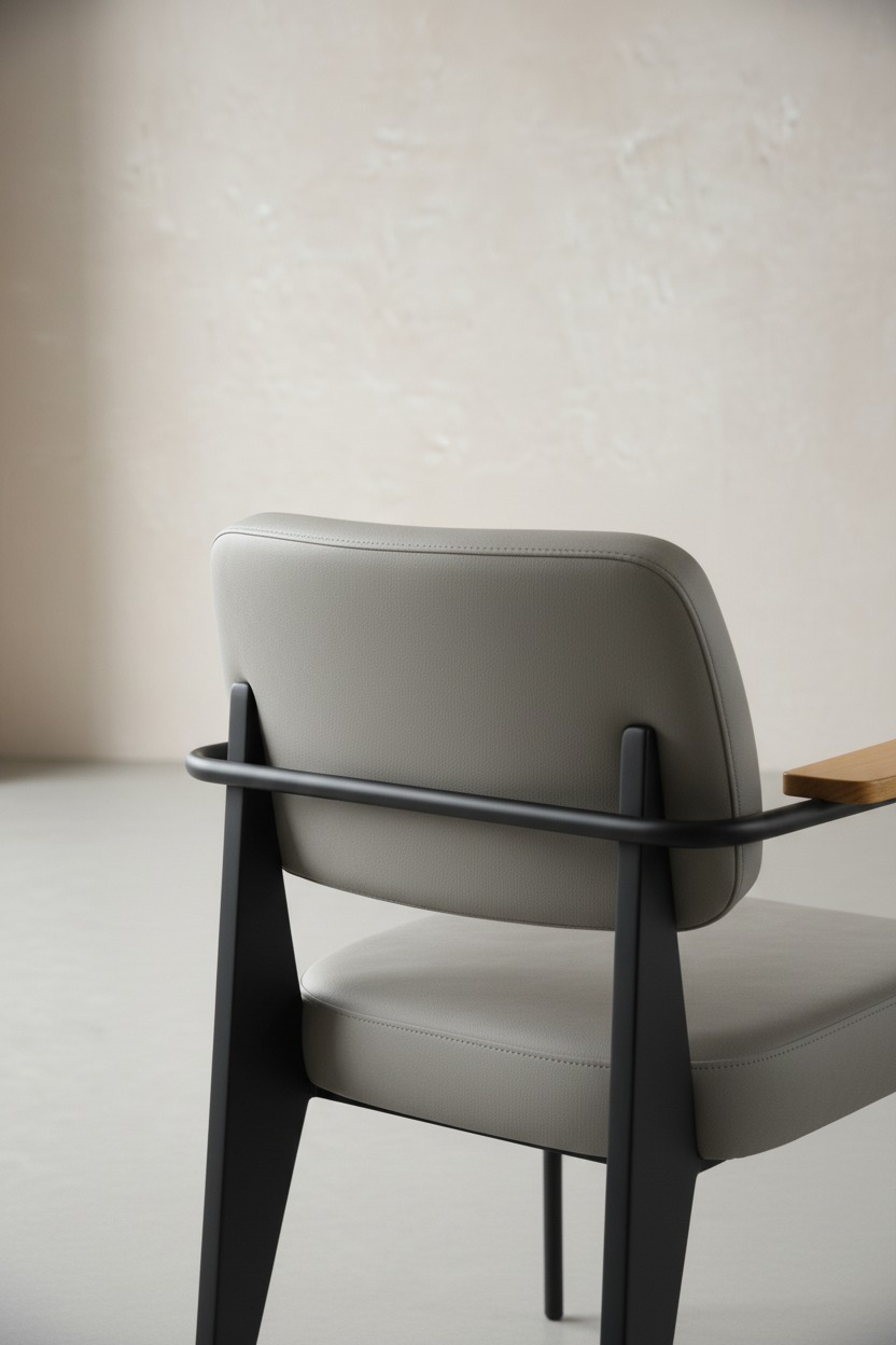 Modern ve endüstriyel çizgilerin birleşimi olan bu sandalye, sağlam siyah metal iskeleti ve doğal ahşap kolçak detaylarıyla öne çıkmaktadır. Ergonomik sırt yapısı ve geniş oturma alanı ile uzun süreli kullanımlarda konfor sağlar. Arka ayaklardaki ikonik geniş panel tasarımı hem estetik bir görünüm hem de ekstra stabilite sunar.