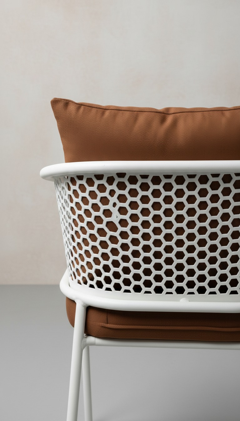 Dayanıklı metal iskelet yapısı ve özgün petek desenli sırt detayı ile hem iç hem de dış mekanlara modern bir dokunuş katar. Ergonomik tasarımı, konforlu oturma alanı ve sırt desteği sağlayan minderleri ile uzun süreli kullanımlar için idealdir. Bahçe, balkon veya modern yemek odası dekorasyonları için şık bir tercihtir.