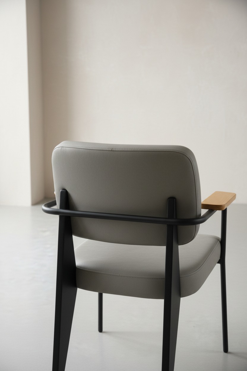 Modern ve endüstriyel çizgilerin birleşimi olan bu sandalye, sağlam siyah metal iskeleti ve doğal ahşap kolçak detaylarıyla öne çıkmaktadır. Ergonomik sırt yapısı ve geniş oturma alanı ile uzun süreli kullanımlarda konfor sağlar. Arka ayaklardaki ikonik geniş panel tasarımı hem estetik bir görünüm hem de ekstra stabilite sunar.